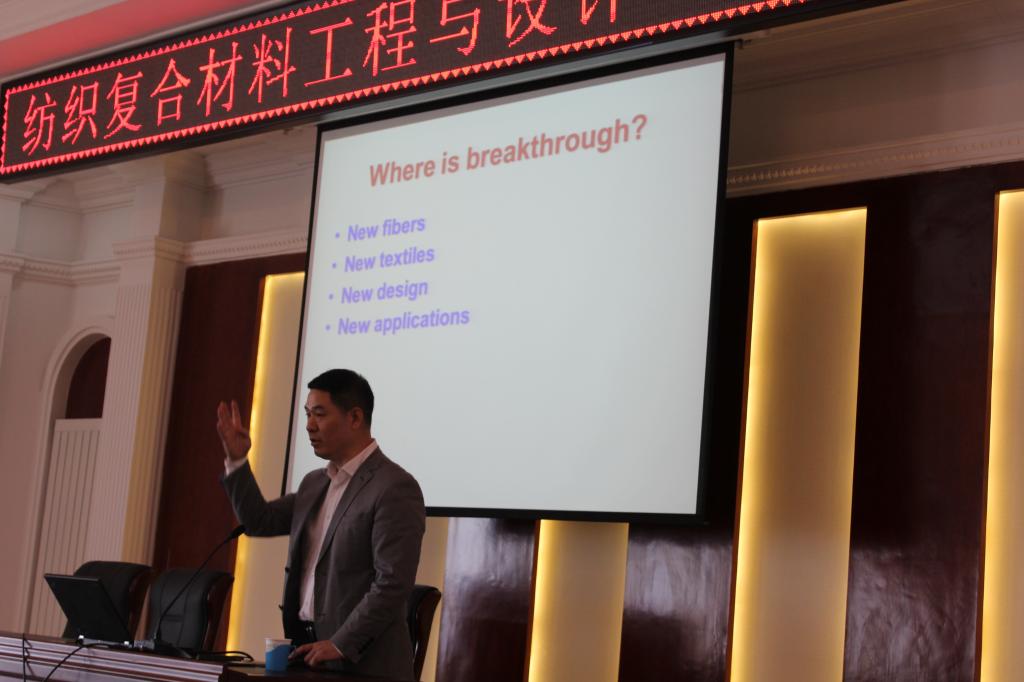 顾伯洪教授围绕纺织复合材料在飞机、汽车、航天领域特别是C919大飞机、天宫一号上的应用,纺织复合材料最新研究进展,纺织结构复合材料结构设计及实验分析、数值模拟等方面进行了系统的讲授,整场报告深入浅出、生动精彩,博得全体师生阵阵掌声。