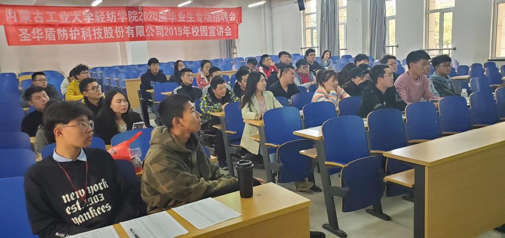 戍鼓断人行,边秋一雁声。圣华盾防护科技股份有限公司于 2019年10月18日下午3时在必一运动官网金川校区c辅101面向必一运动服装设计与工程、服装与服饰设计、纺织工程及轻化工程四个专业的大四应届毕业生开展了此次校园专场招聘会。