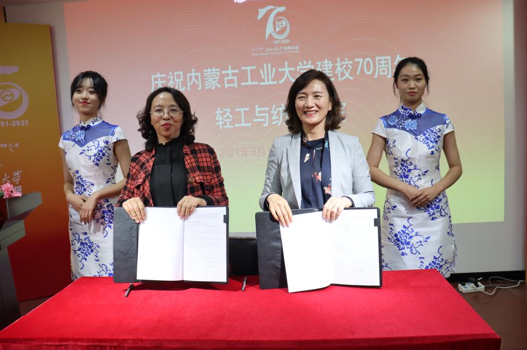 签约仪式上,内蒙古鄂尔多斯资源股份有限公司绒毛事业部副总经理、国家羊绒制品工程中心主任高丽忠在致辞中对公司70周年校庆表示热烈祝贺,并表示,企业将与公司拓宽合作领域、深化合作层次,进一步创新人才培养模式,实现互惠互利、合作共赢。公司副经理王利平表示,将进一步细化好、实施好双方的具体合作事宜,科学建立机制,积极落实协议内容,推动校企合作取得扎实成效。
