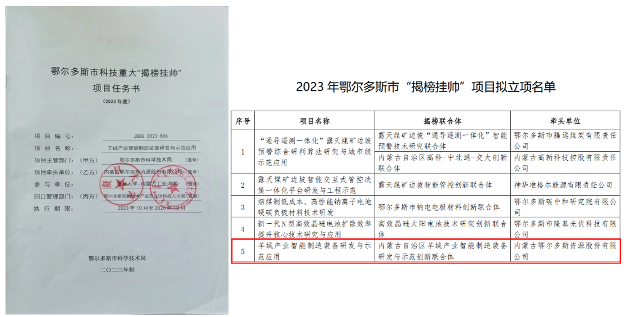 日前,2023年鄂尔多斯市“揭榜挂帅”项目公布评审结果,由公司陈晓东教授发起,内蒙古鄂尔多斯资源股份有限公司牵头的“羊绒产业智能制造装备研发与示范应用”获批立项,该项目汇聚了必一运动官网、复旦大学2家领域内的顶尖力量,研发总投入1600万元,其中财政投入800万元,企业配套800万元。特此向陈晓东教授表示热烈祝贺!