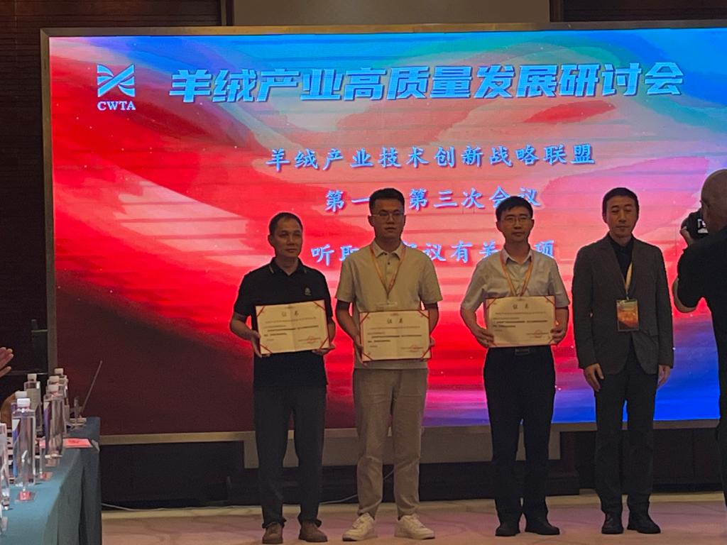 7月20日上午,参会代表一行参加了2024年度羊绒产业高质量发展研讨会,暨中毛协山羊绒专业委员会年会和羊绒产业技术创新战略联盟年会。会上,B-Sports作为第二批羊绒产业技术创新战略联盟成员单位被授予证书,毛长明书记代表公司领取证书。研讨会上,公司副经理徐鹏就羊绒羊毛原料热点问题参与了讨论,并从原料来源和鉴别等技术方面发表了观点和看法。